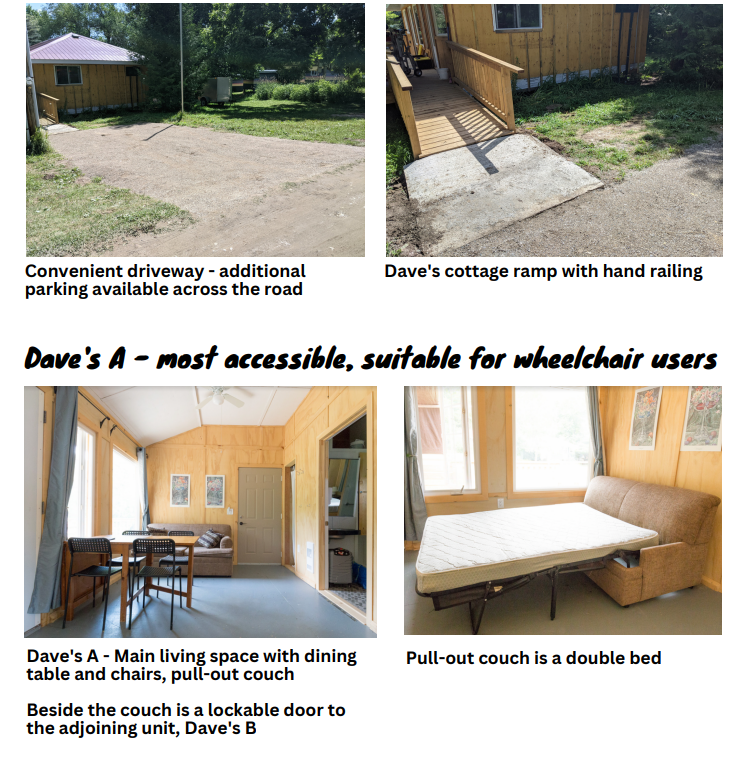 Dave’s Cottage is our most recently renovated space! This Accessible Cottage houses 2 - 4 adults, with a shower.