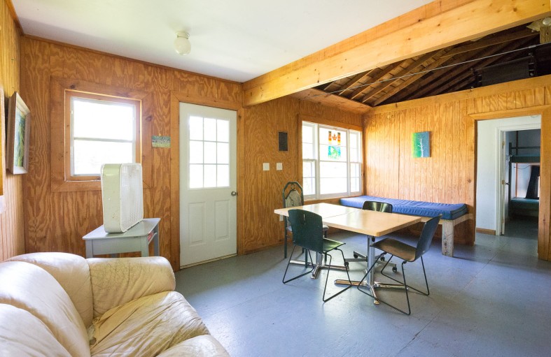 Tom’s cottages provide space for 2 - 4, with one bedroom with a double bunk bed and sliding glass doors onto a back deck. There is a small kitchen with a single burner, half size fridge, a microwave and kettle, and some dishes provided for simple meal prep. There is an additional single cot in this room. The bathroom is a two piece bathroom with an accessible shower. Guests must bring their own pillows and bedding.
