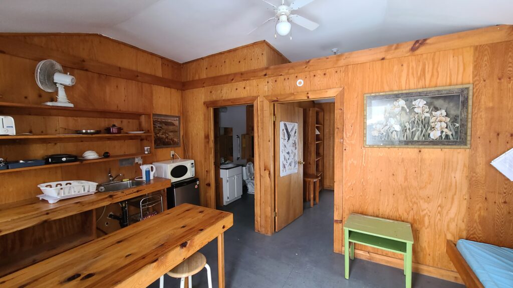 Tom’s cottages provide space for 2 - 4 people, with one bedroom with a double bunk bed and sliding glass doors onto a back deck. There is a small kitchen with a single burner, half size fridge, a microwave and kettle, and some dishes provided for simple meal prep. There is an additional single cot in this room. The bathroom is a two piece bathroom with an accessible shower. Guests must bring their own pillows and bedding.